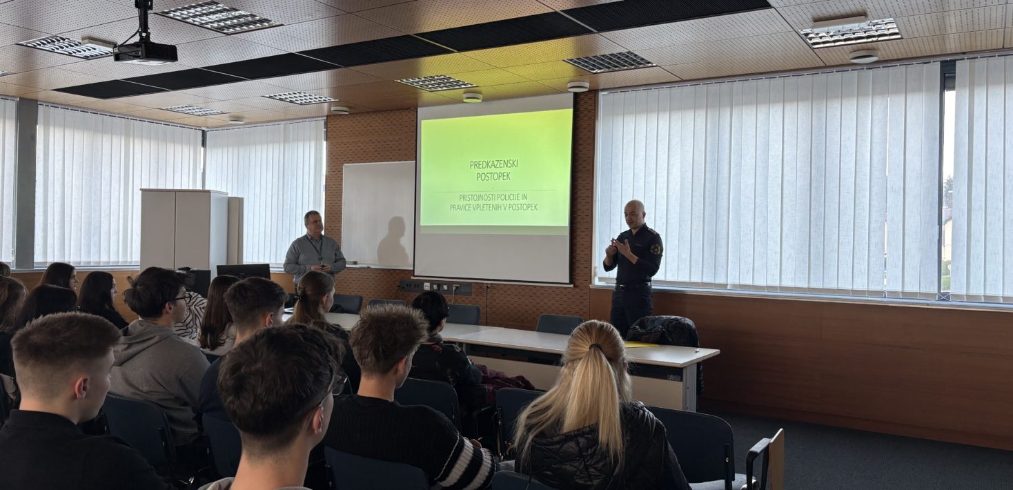 Na policijski postaji Ptuj sta nas gostila komandir postaje mag. Aleksander Lubej in višji kriminalistični inšpektor Edvard Cvetko. Po uvodnem pozdravu komandirja PP Ptuj, nam je inšpektor Cvetko predstavil vlogo in pooblastila policije pri preiskavi in pregonu kaznivih dejanj. Dijaki in dijakinje so se seznanili s postopki ob obravnavi kaznivega dejanja na policiji: od zaznave kaznivega dejanja preko prijave, zbiranja obvestil in dokazov, preiskav, odvzema prostosti do pričanja na sodišču; seznanili so se tudi s pravicami žrtev kaznivih dejanj. Spoznali so tudi različne zadolžitve in specializacije policijskega poklica: od prometnega policista, vodnikov službenih psov in konjenikov do kriminalistov ter policistov v Letalski policijski enoti in v operativno komunikacijskih centrih (113). Spoznali so tudi potek šolanja za policista.