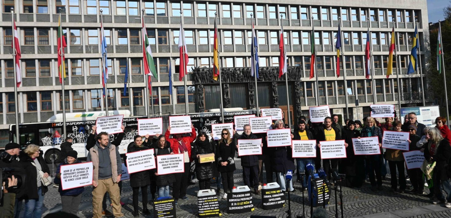 V sredo, 12. 11. 2025, je na Trgu republike potekala novinarska konferenca Glasu ljudstva o predlogu Zakona o varnostnih ukrepih. Predstavniki_ce več nevladnih organizacij in civilne družbe smo na njej izkazali zaskrbljenost nad predlogom Zakona o varnostnih ukrepih, ki bi ob sprejetju znižal standarde vladavine prava in posegel v človekove pravice. Poslance_ke smo pozvali, naj ne podprejo predlaganih ukrepov, namesto tega pa naj naslovijo dolgotrajne in strukturne vzroke diskriminacije romske skupnosti in vzpostavijo pogoje za dostop do ustreznih bivalnih razmer, sanitarne ureditve in pitne vode, do izobraževanja in zaposlitve. Po novinarski konferenci smo Kabinetu predsednika vlade predali podpise peticije, s katero slovensko vlado pozivamo, naj uredi dostop do vode za romske družine na jugovzhodu Slovenije.